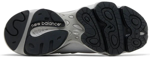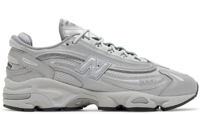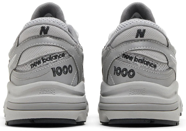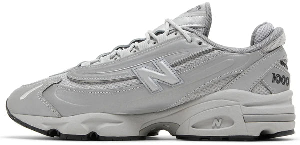 The New Balance 1000 'Reflective Pack - Raincloud' features a breathable mesh base with durable synthetic leather overlays in a reflective finish. Metallic silver accents land on the tongue, marked with New Balance 1000 branding. A sculpted polyurethane midsole, enhanced with ABZORB cushioning in the forefoot and heel, maintains the monochrome aesthetic.